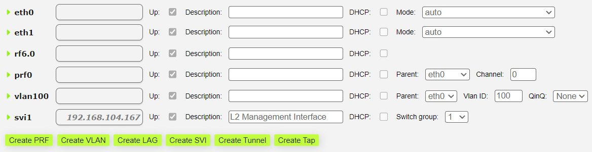 <table><thead><tr><th width="117">Interface</th><th>Description</th></tr></thead><tbody><tr><td><strong>ethX</strong></td><td><ul><li>Configure the IP address(es) and the mask of the interface.</li><li>The IP address(es) of the "<em>ethX"</em> interface is accessible via Ethernet LAN segment only (it won't be accessible via the "<em>rfX"</em>  interface from other neighbor unit).</li><li>The IP address(es) of the "<em>ethX"</em> interface is used in the routing process.</li><li>Enable/disable the interface.</li><li>Enable/disable DHCP - obtain an IP address automatically. DHCP option is disabled by default.</li><li>Set the interface description (up to 72 characters).</li><li><p>Set the interface mode (for example: 1000Base-TX-fullduplex):</p><ul><li>The default value is “<em>Auto</em>” (recommended)</li><li>Optical SFP modules may not work properly in auto-negotiation mode with some devices. In case of troubles with data transmission via the SFP port, it is recommended to set a fixed speed and duplex mode (for example, 1000BaseTX-fullduplex-manual).</li><li>Make sure the same duplex mode is set on both devices.</li></ul></li></ul></td></tr><tr><td><strong>rfX</strong></td><td><ul><li>Configure the IP address(es) and the mask of the interface.</li><li>Enable/disable the interface.</li><li>Enable/disable DHCP - obtain an IP address automatically. DHCP option is disabled by default.</li><li>Set the interface description (up to 72 characters).</li></ul></td></tr><tr><td><strong>sviX</strong></td><td><ul><li>SVI interface is a logical L3 interface of the switch (solely used for the management of the unit).</li><li>Configure the IP address(es) and the mask of the interface (as the management IP address(es) of the unit).</li><li>Enable/disable the interface.</li><li>Enable/disable DHCP - obtain an IP address automatically (as the management IP address(es) of the unit). DHCP option is disabled by default.</li><li>Set the interface description (up to 72 characters).</li><li>Remove the interface.</li><li>Set the Switch group number which this interface is assigned to (bind the SVI interface to a switch group).</li></ul></td></tr><tr><td><strong>prfX</strong></td><td><ul><li>PRF interface makes the Ethernet interface that it is assigned to, to appear as a regular RF interface in terms of the MINT network .</li><li>Configure the IP address(es) and the mask of the interface.</li><li>Enable/disable the interface.</li><li>Enable/disable DHCP - obtain an IP address automatically.</li><li>Set the interface description (up to 72 characters).</li><li>Remove the interface.</li><li>Set the parent interface to be transmitted the encapsulated packets (assign the PRF interface to the physical Ethernet interface).</li><li>Set the channel number (from 0 to 3) on which the frames are sent and received by the parent interface.</li><li>Both PRF interfaces (of the two units in the link) must have the same channel assigned in order to establish the wireless link.</li></ul></td></tr><tr><td><strong>vlanX</strong></td><td><ul><li>Configure the IP address(es) and the mask of the interface in case you use this interface for the management of the unit, only (not recommended way).</li><li>Enable/disable the interface.</li><li>Enable/disable DHCP - obtain an IP address automatically.</li><li>Set the interface description (up to 72 characters).</li><li>Remove the interface.</li><li>Set the parent interface to be transmitted the encapsulated packets.</li><li>Configure the VLAN tag (or VLAN ID) for the current interface (from 1 to 4094).</li><li><p>In the drop-down window, you can select the vlan interface operation mode:</p><ul><li>802.1q - vlan tag operations are performed according to this standard;</li><li>802.1ad - double tagging "QinQ";</li><li>802.1ah - backbone bridge using mac-in-mac technology described by the IEEE 802.1ah-2008 standard.</li></ul></li></ul></td></tr><tr><td><strong>lagX</strong></td><td><ul><li>Link aggregation interface is a logical interface used to combine multiple physical channels into one logical channel in order to increase link capacity and redundancy (for the units with two physical Ethernet ports).</li><li>Configure the IP address(es) and the mask of the interface.</li><li>Enable/disable the interface.</li><li>Enable/disable DHCP - obtain an IP address automatically.</li><li>Set the interface description (up to 72 characters).</li><li>Remove the interface.</li><li>Set the parent interface to be aggregated the encapsulated packets.</li><li>Enable/disable Fast Mode.</li></ul></td></tr><tr><td><strong>tunX</strong></td><td><ul><li>Configure the IP address(es) and the mask of the interface.</li><li>Enable/disable the interface.</li><li>Enable/disable DHCP - obtain an IP address automatically.</li><li>Set the interface description (up to 72 characters).</li><li>Remove the interface.</li><li>Set the tunneling mode: IPIP or GRE.</li></ul></td></tr><tr><td><strong>tapX</strong></td><td><ul><li>Configure the IP address(es) and the mask of the interface.</li><li>Enable/disable the interface.</li><li>Enable/disable DHCP - obtain an IP address automatically.</li><li>Set the interface description (up to 72 characters).</li><li>Remove the interface.</li></ul></td></tr></tbody></table>