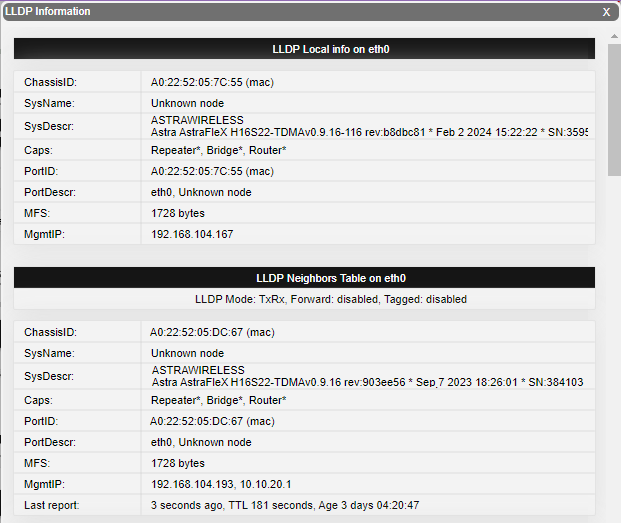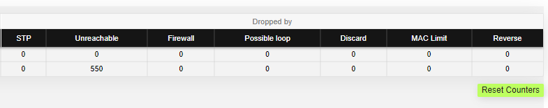 <table><thead><tr><th width="164">Parameter</th><th>Description</th></tr></thead><tbody><tr><td><strong>ID</strong></td><td>The ID of a switch group or Kernel</td></tr><tr><td><strong>MAC Count</strong></td><td>The MAC addresses number involved in data transmission within this switch group</td></tr><tr><td><strong>Unicast</strong></td><td>Sending a packet to a single host (network destination) identified by a unique address</td></tr><tr><td><strong>Broadcast</strong></td><td>Sending a packet to all hosts (network destinations) simultaneously (broadcasting is done by specifying a special broadcast address on packets)</td></tr><tr><td><strong>Flood</strong></td><td>Unicast packets whose MAC address is not in the device's switching table are partially discarded in order to reduce the radio link load. A detailed description is available in the <a href="https://wiki.astrawireless.net/astra-wireless-documentation/technical-documentation/astra-evolution-technical-user-manual/troubleshooting/unicast-flood-detection">Unicast-flood detection⁣⁣⁣⁣</a> article.</td></tr><tr><td><strong>STP</strong></td><td><p>Spanning Tree Protocol - standardized as IEEE 802.1D</p><p>Creates a spanning tree within a network of connected layer-2 bridges (typically Ethernet switches) and disables those links that are not part of the spanning tree, leaving a single active path between any two network nodes</p><p>The value displayed in the Switch Statistics table represents the number of the packets blocked by the Spanning Tree Protocol</p></td></tr><tr><td><strong>Unreachable</strong></td><td><p>The sender could not reach the specified network destination</p><p>The value displayed in the Switch Statistics table represents the number of the packets dropped because they flood to unreachable destination</p></td></tr><tr><td><strong>Firewall</strong></td><td><p>A software or hardware-based network security system that controls the incoming and outgoing network traffic by analyzing the data packets and determining whether they should be allowed through or not, based on applied rules set</p><p>The value displayed in the Switch Statistics table represents the number of the packets dropped by the firewall system in the network</p></td></tr><tr><td><strong>Possible loop</strong></td><td><p>A switching or bridging loop occurs in a network when there is more than one Layer 2 path between two endpoints</p><p>Because a physical topology that contains switching or bridging loops is needed for the redundancy reasons, the solution is to allow physical loops, but create a loop-free logical topology using the spanning tree protocol (STP) on the network switches</p><p>The value displayed in the Switch Statistics table represents the number of the packets dropped because they belong to a possible loop (more than one port declares same packet source)</p></td></tr><tr><td><strong>Discard</strong></td><td>The value displayed in the Switch Statistics table represents the number of the packets dropped by the configuration (for example: "switch group N start [discard]")</td></tr><tr><td><strong>MAC Limit</strong></td><td><p>MAC address-table limit reached (switch maxsources (MAXSOURCES|0) # default 5000)</p><p>The value displayed in the Switch Statistics table represents the number of the packets dropped because the limit of MAC address-table was reached</p></td></tr><tr><td><strong>Reverse</strong></td><td>The value displayed in the Switch Statistics table represents the number of the packets dropped because they have the same source and destination port (the frame came to the unit through one port and according to the switching table it must leave through the same port)</td></tr></tbody></table>
