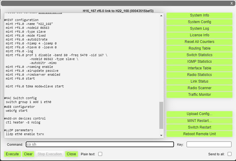 You can execute the same command from the BS to all CPEs in the network (to the nodes that are linked to the BS) by marking “*Send to all*” checkbox before clicking the «**Execute**» button.