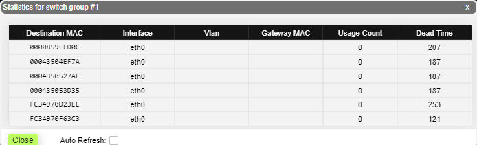 This section displays the number of detected MAC addresses, unicast, broadcast and flood packets switched within each Switch group and also within kernel system (internal traffic), in real-time (since the last reboot):