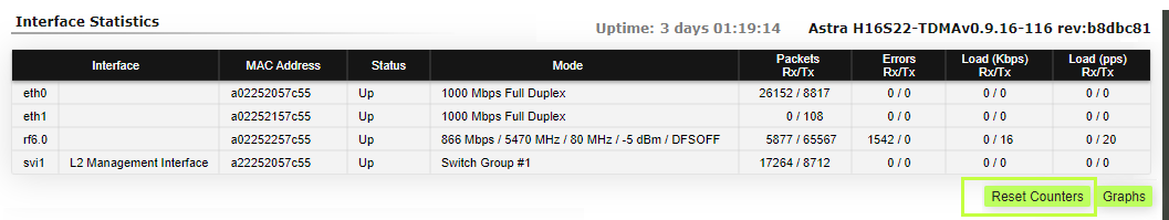 <table><thead><tr><th width="150">Parameter</th><th>Description</th></tr></thead><tbody><tr><td><strong>Interface</strong></td><td>Displays all physical and logical set interfaces </td></tr><tr><td><strong>MAC Address</strong></td><td>Displays the MAC address of each interface</td></tr><tr><td><strong>Status</strong></td><td>Displays for each interface whether it is “up and running” or not</td></tr><tr><td><strong>Mode</strong></td><td><ul><li><p>Displays the operation mode of each interface.</p><ul><li><p>Ethernet interface: </p><ul><li>10,100 or 1000 Mbps;</li><li>Half or full duplex mode - red value of this parameter informs that transmission is performed in a half-duplex mode.</li></ul></li><li><p>Radio interface:</p><ul><li>Bitrate;</li><li>Operating frequency - red value of this parameter indicates an absence of data transmission due to the spectrum scanning by the DFS tool;</li><li>Channel width;</li><li>TX Power - red value for this parameter may indicate a problem with the transceiver's hardware.;</li><li>DFS tool state.</li></ul></li><li><p>SVI:</p><ul><li>Switch group number.</li></ul></li><li><p>PRF interface:</p><ul><li>Parent;</li><li>Channel number;</li><li>Frame size - red value of this parameter means impossibility to set the optimal size due to external limitation (MTU value on the switch port).</li></ul></li><li><p>Vlan interface:</p><ul><li>Parent;</li><li>Vlan ID;</li><li>Selected vlan interface operation standard.</li></ul></li></ul></li></ul></td></tr><tr><td><strong>Packets</strong></td><td>Displays the number of received and transmitted packets for each interface since the unit is operational. The local system packets are counted, too (and not only the ones that are passing through the switching groups - data traffic)</td></tr><tr><td><strong>Errors</strong></td><td>Displays the number of received and transmitted error packets for each interface since the unit is operational</td></tr><tr><td><strong>Load</strong></td><td>Displays the packet flow through each interface in real-time (for the system and the data traffic)</td></tr></tbody></table>
