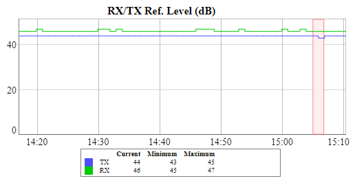 This chart displays the measured RX (green) and TX (blue) signal levels. Red regions represent link outages. The default graph uses the CINR measurement method; however, the RSSI method can be selected from the drop-down menu.