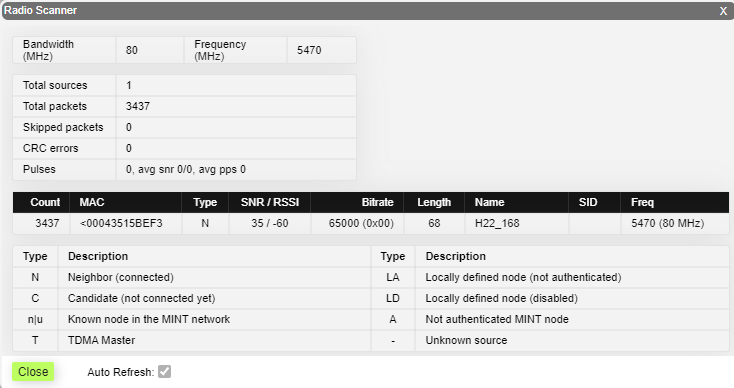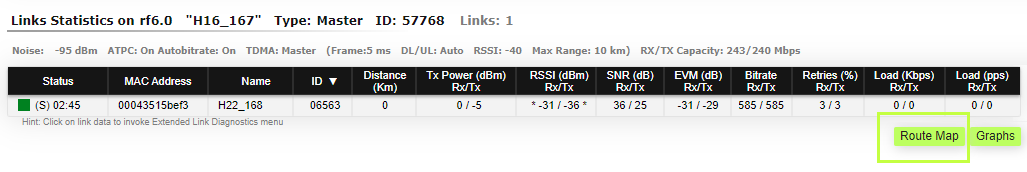 <table><thead><tr><th width="154">Parameter</th><th>Description</th></tr></thead><tbody><tr><td><strong>Status</strong></td><td><ul><li><p>Gives a color indication for the wireless connection quality with the neighbor unit:</p><ul><li>Red:  poor connection</li><li>Yellow: good connection</li><li>Green: excellent connection</li></ul></li><li>Link Uptime. Displays the link uptime</li><li>F – relevance of remote unit firmware (optional). Idicates that the remote unit has the older firmware than the local one</li><li>? – system password of the remote unit (optional). Idicates that the remote unit has not the system password</li><li>E – Ethernet port status on the remote device (optional). Indicates that the remote device Ethernet port is flapping</li></ul></td></tr><tr><td><strong>MAC Address</strong></td><td>Displays the neighbor’s MAC address</td></tr><tr><td><strong>Name</strong> </td><td>Displays the neighbor’s name</td></tr><tr><td><strong>Node ID</strong></td><td>Displays the sequential number of the neighboring node</td></tr><tr><td><strong>Distance</strong></td><td><ul><li>Displays the calculated (theoretical) distance to the neighbor unit (in Km)</li><li>Deflection angle from the main antenna direction towards the subscriber terminal, in the column "Distance" (only for sector base station with "Q" index, which have antanna with beamforming technology support).</li></ul></td></tr><tr><td><strong>Tx Power</strong></td><td>Displays the power level of the Tx and Rx signals of the neighbor unit (in dBm)</td></tr><tr><td><strong>RSSI</strong></td><td>Displays the received signal level in dBm, the optimal value is in the range from -60 to -40. "*" – indicates the difference in the signals power of the vertical and horizontal polarizations</td></tr><tr><td><strong>SNR</strong></td><td>Displays the ratio of the useful signal power to the noise power for the input and output signals at the neighbor unit (in dB). For radio link stable operation, the SNR value must in the range of 12-50 dB, higher modulation are available at values of 27-50 dB</td></tr><tr><td><strong>EVM</strong></td><td>Displays the input signal quality in dB. For stable operation, its absolute value should be as high as possible - not less than 21 dB</td></tr><tr><td><strong>Bitrate</strong></td><td>Displays the set bitrate value for the Tx and Rx signals of the neighbor unit</td></tr><tr><td><strong>Retries</strong></td><td>Displays the percentage of Tx and Rx retries of the neighbor unit</td></tr><tr><td><strong>Errors</strong></td><td>Displays the percentage of Tx and Rx errors of the neighbor unit</td></tr><tr><td><strong>Load</strong></td><td>Displays the number of kbps and packets that are going inbound and outbound the radio interface of the neighbor unit (main data)</td></tr></tbody></table>