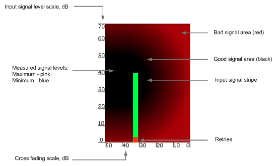 During the alignment test, the Input Signal stripe may change its position along the Cross Fading scale and increase or decrease in height, indicating the changes in the received signal. When the top of the stripe changes its location, moving from one point on the background area to another, it leaves pink and blue marks behind, indicating the maximum and minimum measured levels of the signal at a particular point. Thus, it makes possible to observe the “history” of the signal changes.
