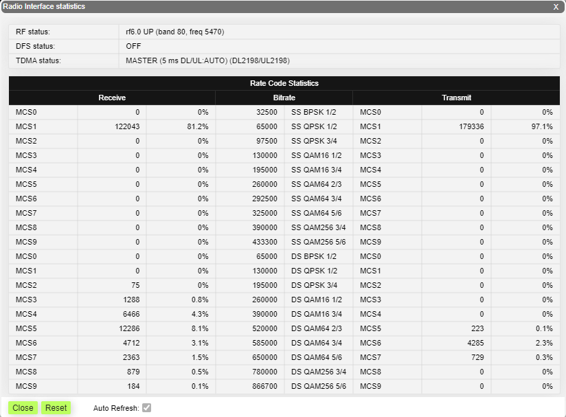<table><thead><tr><th width="227">Parameter</th><th>Description</th></tr></thead><tbody><tr><td>Broadcast Rate</td><td>Current Bitrate for broadcast and multicast frames on the BS depends on the speed of the slowest subscriber</td></tr><tr><td>Bytes Received</td><td>Number of received bytes including headers </td></tr><tr><td>Packets Received OK</td><td>Number of correctly received packets </td></tr><tr><td>Multicas frames</td><td>Number of received multicast frames</td></tr><tr><td>Load (kbps)</td><td>The link load, Kbit/s</td></tr><tr><td>Load (pps)</td><td>The link load, packets per second</td></tr><tr><td>Frame size (bytes)</td><td>The frame size in bytes</td></tr><tr><td>RX Medium Load</td><td>Time spent on receivin d g frames (%)</td></tr><tr><td>Total Medium Busy</td><td>The total time medium was busy (both DL and UL) (%)</td></tr><tr><td>Frames dropped</td><td>The number of dropped frames</td></tr><tr><td>Duplicate Received</td><td>The number of duplicate frames received</td></tr><tr><td>Lost frames</td><td>The number of lost frames</td></tr><tr><td>RX collision</td><td>The number of frames damaged in the receiving channel</td></tr><tr><td>CRC Errors</td><td>Total frames received with a CRC error</td></tr><tr><td>Noise Floor</td><td>Input noise level. Measurement cycle –10 seconds </td></tr><tr><td>RX subslots/nodes</td><td>Frame subslots number allocated for received data / number of subscribers</td></tr><tr><td>RX time limit</td><td>Payload for incoming traffic, ms</td></tr><tr><td>Rx Cap (Mbps)</td><td>Throughput limit for UL (Mbps)</td></tr></tbody></table>
