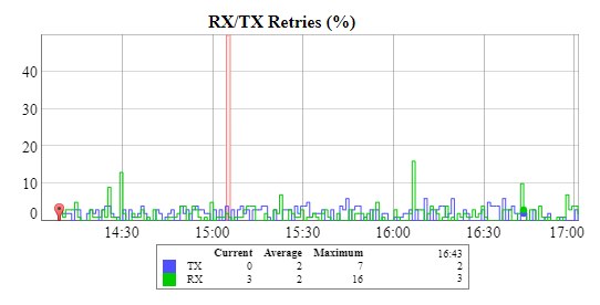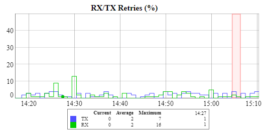 This chart displays the retry percentage (it provides a quick estimation of the link quality). Similar to the previous graph, RX retries are represented by the green lines, TX retries by the blue lines and link outages by the red lines.